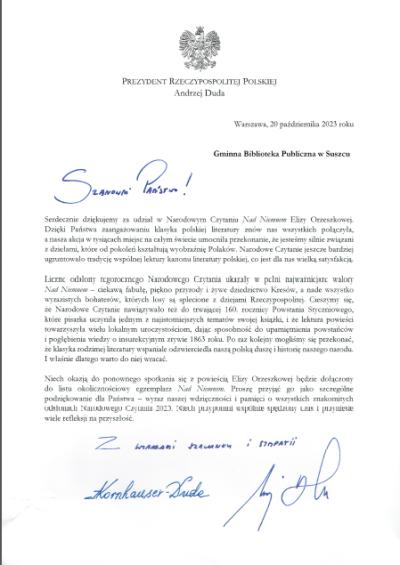 Za wzięcie udziału w akcji Biblioteka otrzymała unikatowy egzemplarz tegorocznej lektury oraz pismo z kancelarii prezydenta. Link do pinezki: https://www.prezydent.pl/aktualnosci/inicjatywy/narodowe-czytanie/2023-nad-niemnem/uczestnicy-akcji/events,suszec,7457